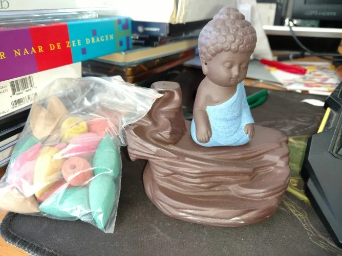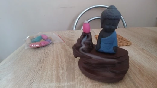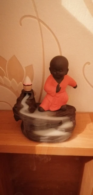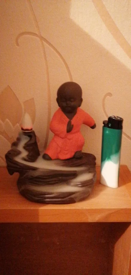 It works like the picture, nice natural feeling clay, the little guy is separated from the main piece and the provided incense smells nice. Very happy with this product, would recommend!